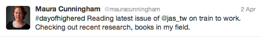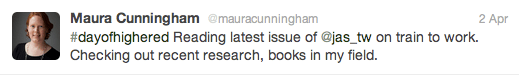Though I had seen Bessette’s blog post and tweets proposing the #dayofhighered, I didn’t really plan to participate (or decide that I wouldn’t participate); mass Twitter exercises like this usually aren’t my thing. But early Monday morning, I settled into a seat on the train from Princeton to New York, pulled out the latest issue of the Journal of Asian Studies, and started to read an article. And right then, I realized that this was exactly the kind of activity that Bessette suggested we tweet about: in the 50 minutes I’d spend on the train, I wasn’t sleeping, staring out the window, or digging into a murder mystery—I was catching up on the newest research and publications in Asian studies. I pulled out my phone and tweeted.