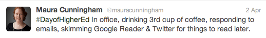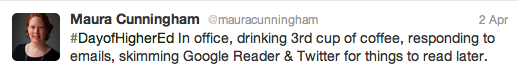 On Bessette’s original blog post and in a few tweets I saw over the course of the day, some commented that the #dayofhighered was just about whining—a chance to collectively complain about how overworked, underpaid, and under-appreciated academics are. And, I will admit, quite a number of us (myself included) tweeted about eating lunch at our desks and spending more time on administrative minutiae than interacting with students or working on research.