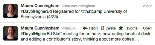 I only contributed three more tweets to the hashtag over the course of the day, primarily because I spent most of the workday meeting with and talking to colleagues, not sitting in front of my computer, so there wasn’t much time for Twitter. Also, I do generally avoid chronicling my entire life on the Internet, as I don’t think even my closest friends care to hear about every move I make. I viewed my four tweets more as a contribution, a suggestion of the types of tasks that occupy my time on a typical in-the-office workday. (I work at home three days a week, and that time looks very different from when I’m in New York—at home, my focus is on my dissertation and other writing/editing projects.)
