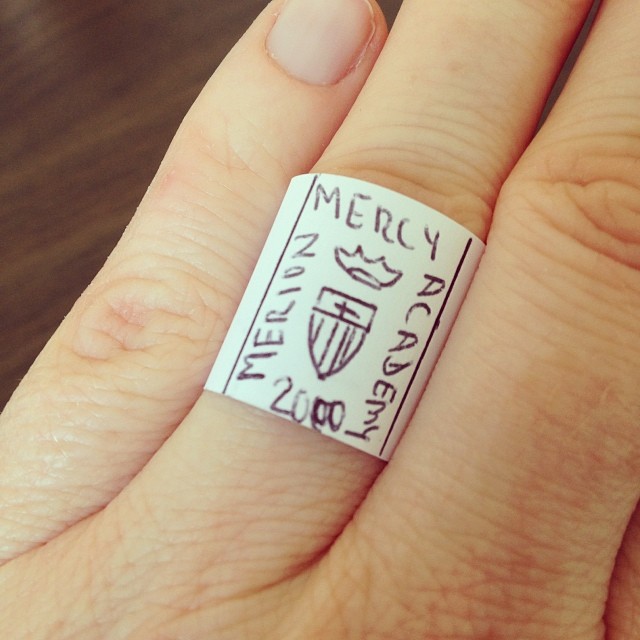 Obviously, this ring frenzy wasn’t spontaneous—it was, rather, a celebration organized by Moira McGoldrick (my classmate and friend!) to wish the current Merion juniors luck on their own Ring Day. Last weekend, Moira circulated an email on the alumnae list asking us all to take a minute and share a picture of ourselves with our rings, and people responded. Big time. Scrolling through the MMA Alumnae Facebook page, I count about 150 #MerionMercyRingDay posts. Some women wrote laments that they had lost their rings, or that they had been stolen, often asking how they could order replacements. People shared memories of their Ring Mass, of times when they had nearly lost their rings, but then recovered them, of waiting impatiently for the spring of their junior year so they too would finally have a Merion ring to wear. I remember that feeling.