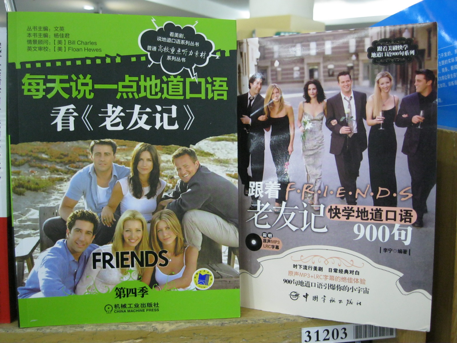 I’ve known about the lure of Friends ever since coming to China in 2005, when one of my language teachers and I had a conversation about the American TV series that Chinese viewers enjoyed the most. She said that while she and her girlfriends liked to watch Sex and the City, they found some of the subject matter embarrassing (“Do you and your friends actually talk about things like that?!?” she asked me, both fascinated and horrified). Friends, although it still touched on topics that most young Chinese wouldn’t necessarily feel comfortable discussing in mixed company, was comparatively PG-rated. Its relatively simple dialogue also helped those trying to learn English improve their American slang, and I’ve found multiple “Friends English” workbooks and guides in Chinese bookstores over the years.