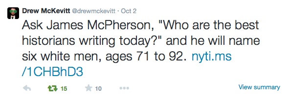 But of course, those aren’t the only people writing good history today. (Sometimes a woman [other than Doris Kearns Goodwin] even writes a halfway decent book!) On Facebook, Twitter, and blogs, historians decried the narrowness of McPherson’s responses. What’s the problem with his list? I’ll let “Historista” (Megan Kate Nelson) explain: