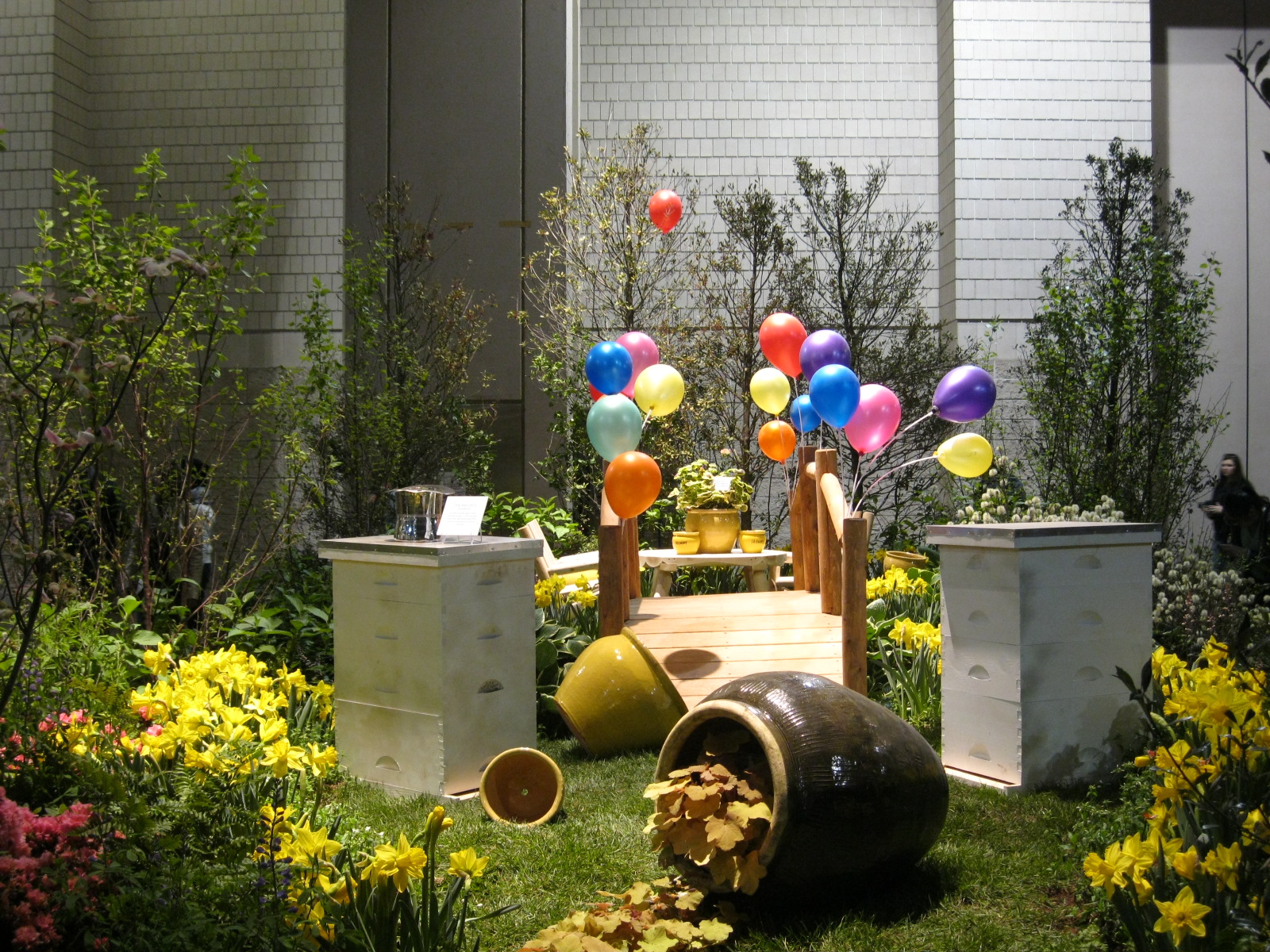 Disney is a major sponsor of the show this year, so the exhibit designers were instructed to design displays inspired by [Disney] movies, but not directly replicate scenes from them. So, for example, we saw a classical Chinese garden (Mulan) and a treehouse in the jungle (Tarzan). “Pooh’s Hunny Depot” had honey (“hunny”) pots serving as planters and featured the bridge where he and Piglet played Poohsticks.