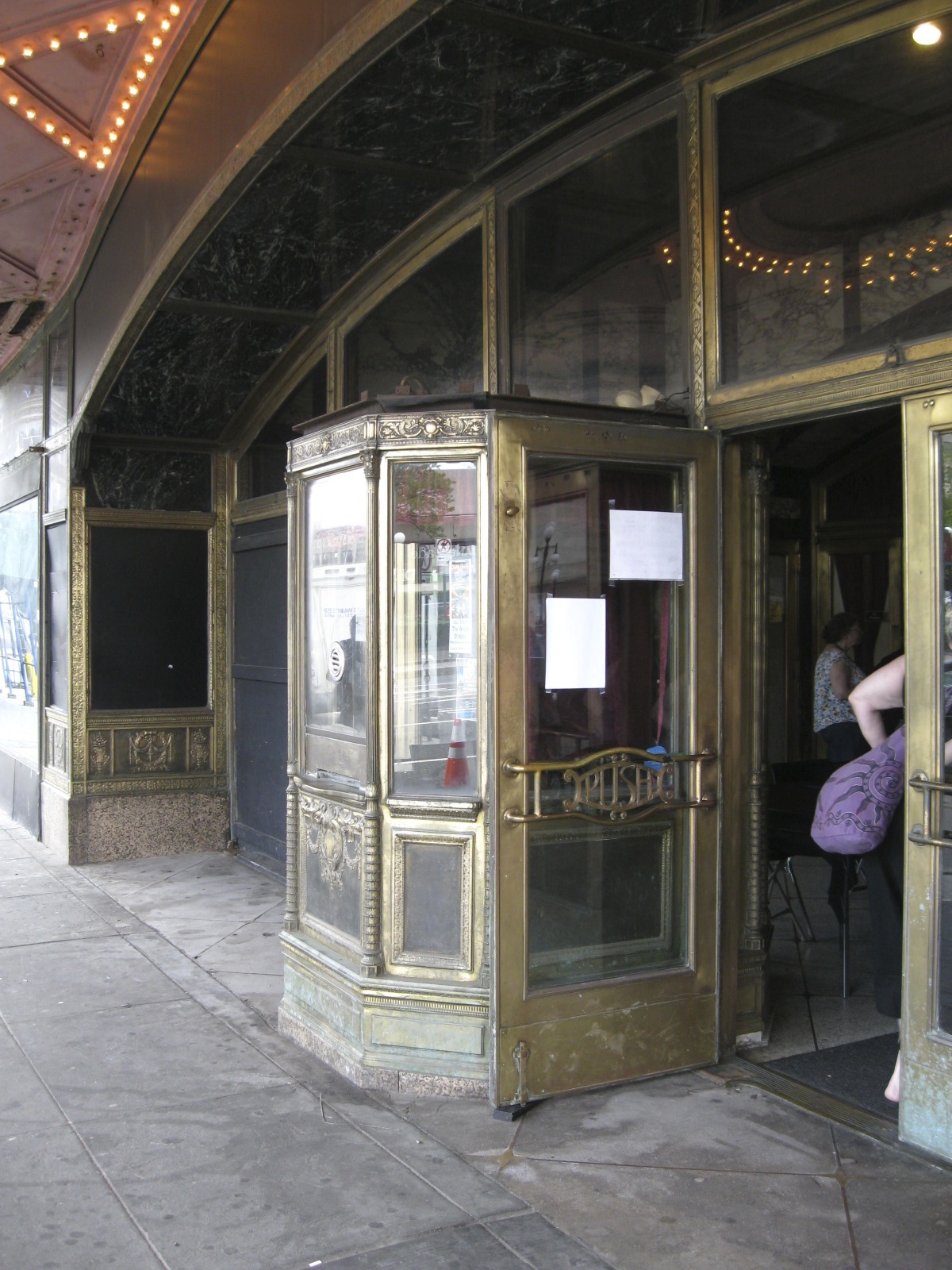 Continuing down JFK Boulevard as rain drops began spattering the sidewalk, I took refuge under the grand marquee of the Loew’s Jersey. Completed in 1929 (opening day was only one month before the stock market crashed in October of that year), the exterior of the Loew’s is far more ornate than that of The Stanley. Carvings adorn the sand-colored stone façade, an oxidized green statue sitting at the top beneath a stone arch. The old-fashioned ticket booth, now faded to a dull brass, is decorated with scrollwork. A sign posted outside boasts that the Loew’s houses the “Best Movie Theater Organ in NYC Area,” per The Village Voice. Everything about the Loew’s hints at its glamorous red-carpet past.