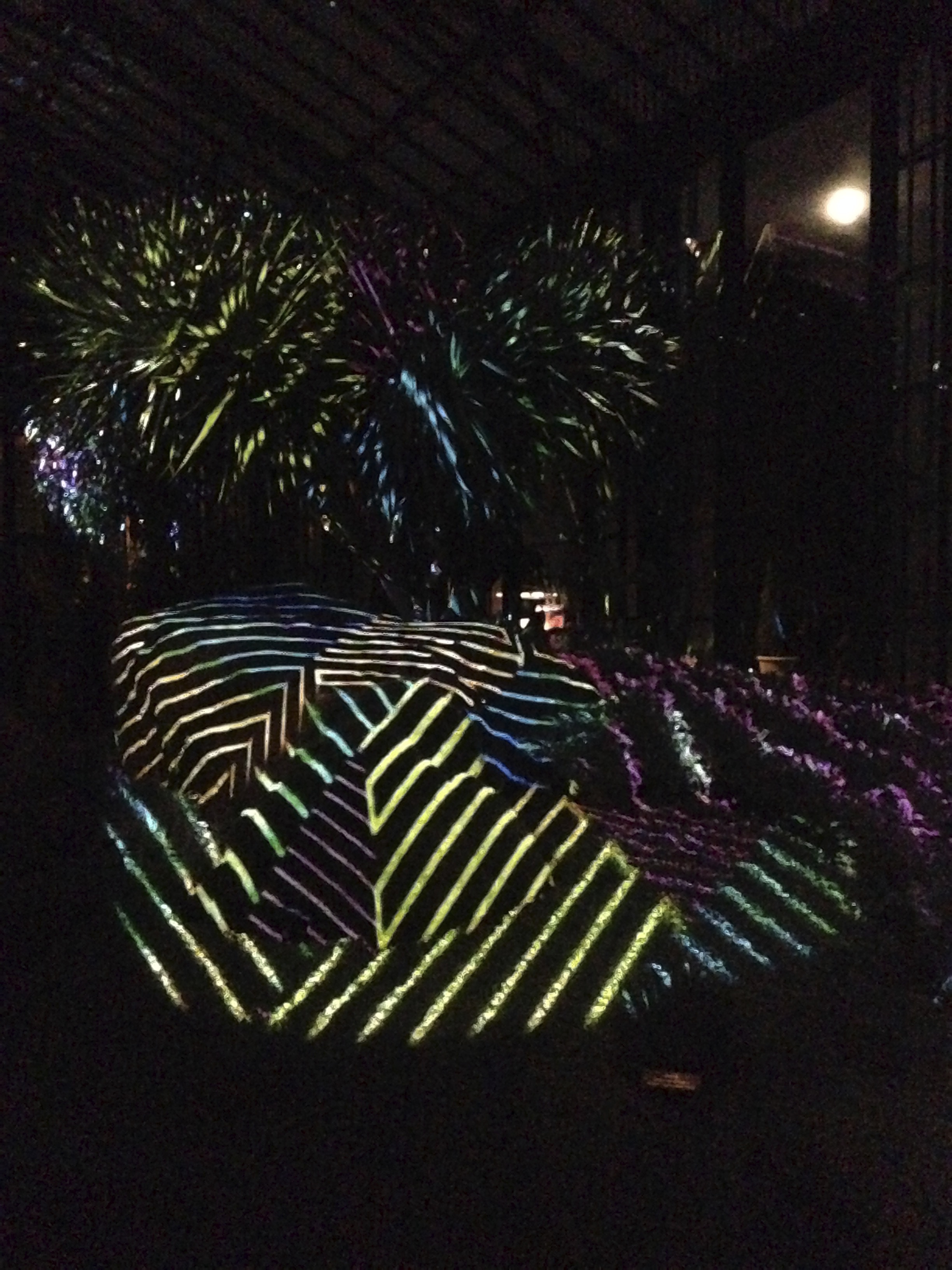 Finally snapping out of it, we joined a huge line waiting to get into the Palm House for the next installation. This was the most like being in a club: neon lights strobed off the palm fronds while ominous electronica played over the sound system. (The first 35 seconds of this YouTube video convey the experience much better than my photos did.)