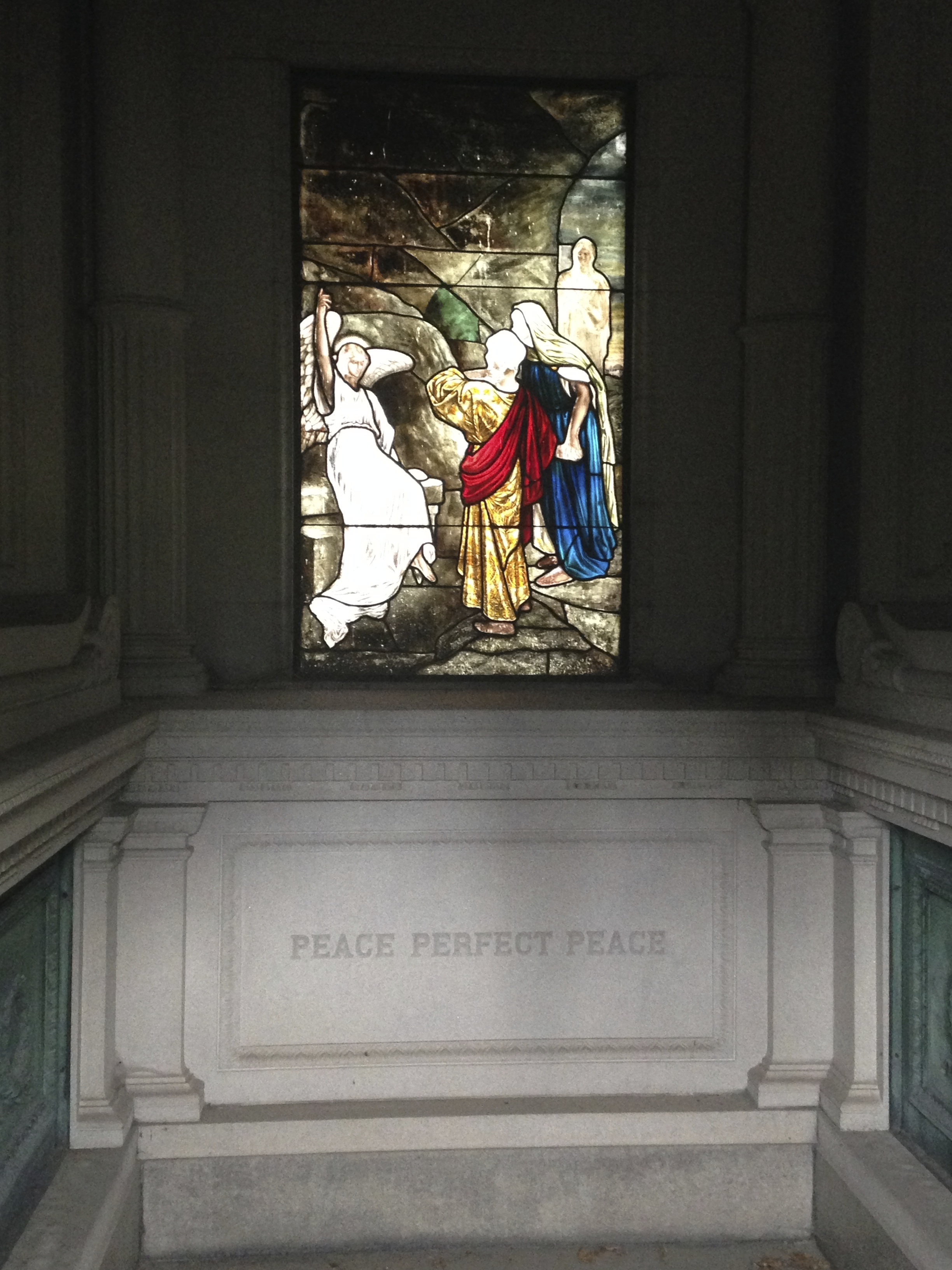 Laurel Hill grew steadily over the course of the 19th century, its green hills increasingly studded with monuments—most plain, but some quite elaborate. As we were on the basic introductory tour, Nancy focused on pointing out the cemetery’s most famous occupants, ranging from Civil War general George Meade to legendary Phillies broadcaster Harry Kalas. (Meade’s used to be Laurel Hill’s most visited gravesite; recently, though, Kalas overtook him in visitors.) We also saw one famous fictional grave: <spoiler alert> the tombstone for Adrian Balboa used in Rocky Balboa, now carefully tended off to the side of the main burial grounds.