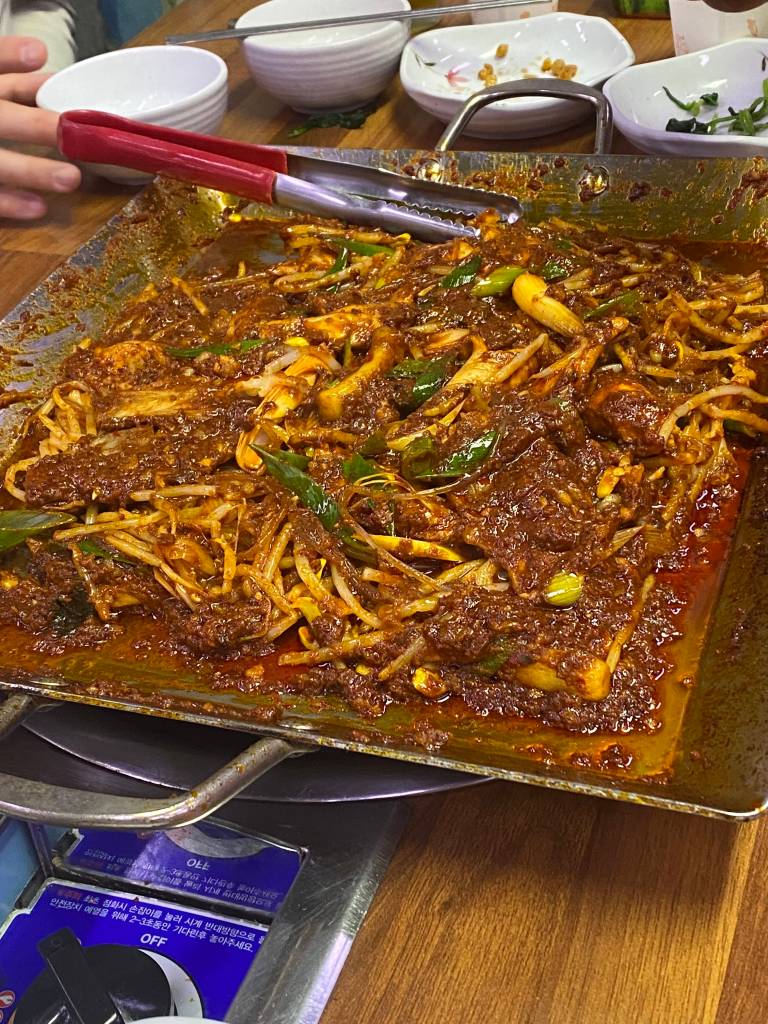 On two evenings I ate out with Korean-speaking colleagues, who expanded my palate beyond bibimbap bowls and gimbap rolls with raucous dinners around dishes of gamjatang (pork bone soup) and spicy broiled/stir-fried blowfish, a Daegu specialty. After our meal one night we ran across the street to a tiny noraebang establishment and sang (“sang” in my case) karaoke for two hours.