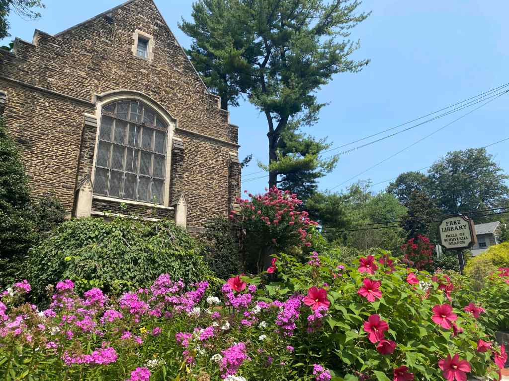 Feature photo: Garden and exterior of the Falls of Schuylkill* Library in Philadelphia’s East Falls neighborhood, August 1, 2023.