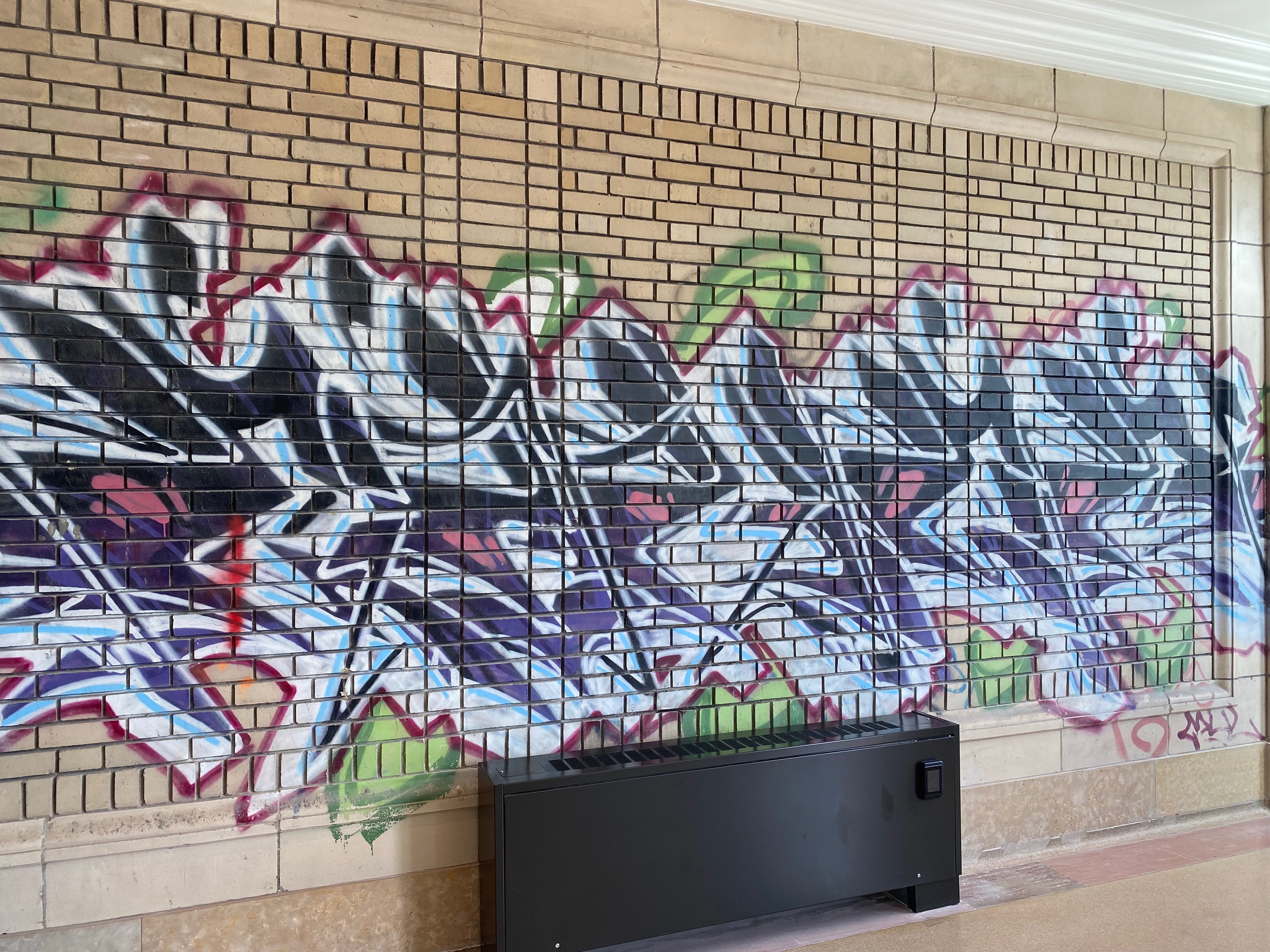 The final major space is the South Concourse, whose spectacular skylight had to be completely replaced. Beneath the glass ceiling is me + you, “an interactive open source AI artwork” that had such a crowd within it that I just walked around the perimeter. I exited the station through a short hallway, its walls lined with “the last graffiti at Michigan Central,” as a placard announces. To capture the station’s full history—both the aura of its heyday and the years of its abandonment—the restoration team decided to maintain some of the graffiti that once covered the entire space.