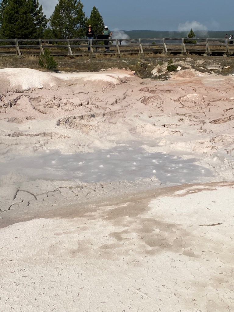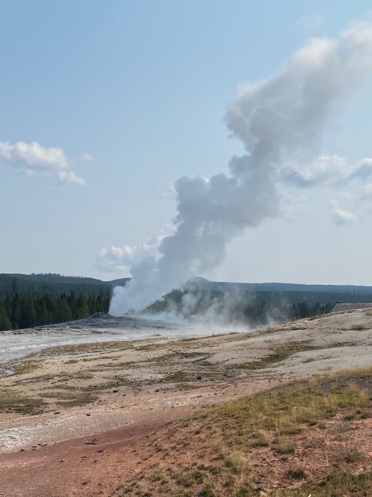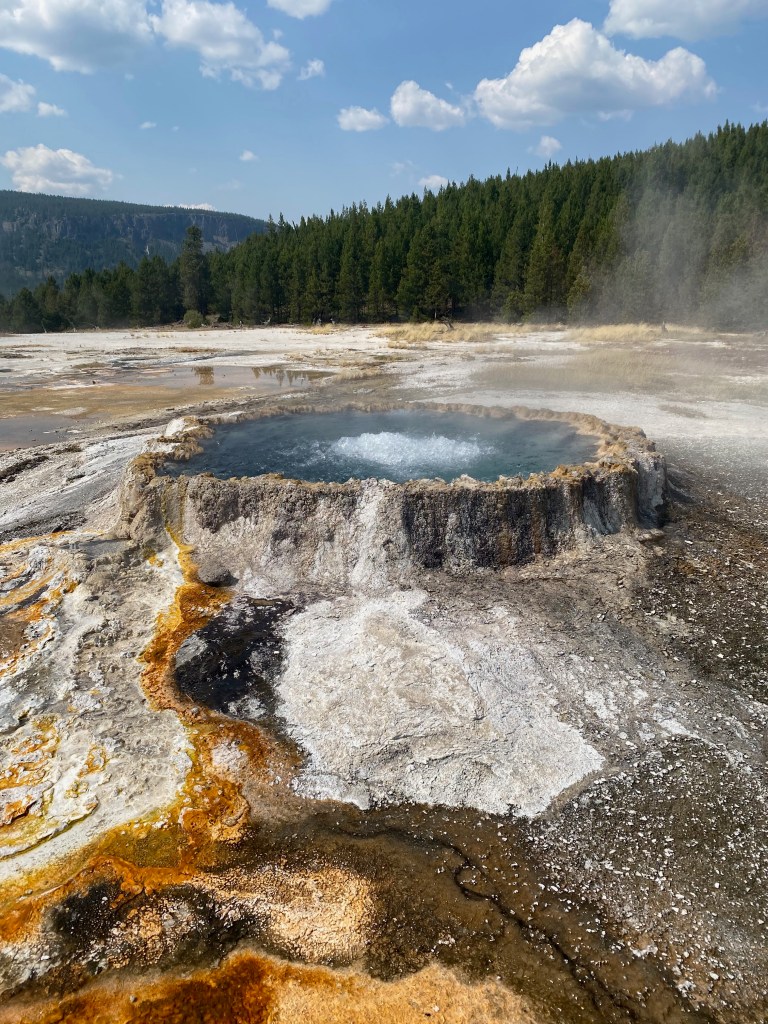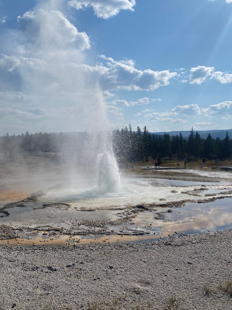 The most famous geyser, of course, is Old Faithful. I saw it erupt two or three times during my trip, joining hundreds of other spectators on a semicircle of benches to watch it spout water and steam up into the air. Old Faithful’s is the most frequent and predictable of the geyser eruptions, and its placement at the edge of the Upper Geyser Basin has enabled the park to build infrastructure (a large visitor center and immense parking lot) around it, making it accessible to all. But—with no disrespect to OF—I thought the other geysers and geothermal features in the area were much more interesting.