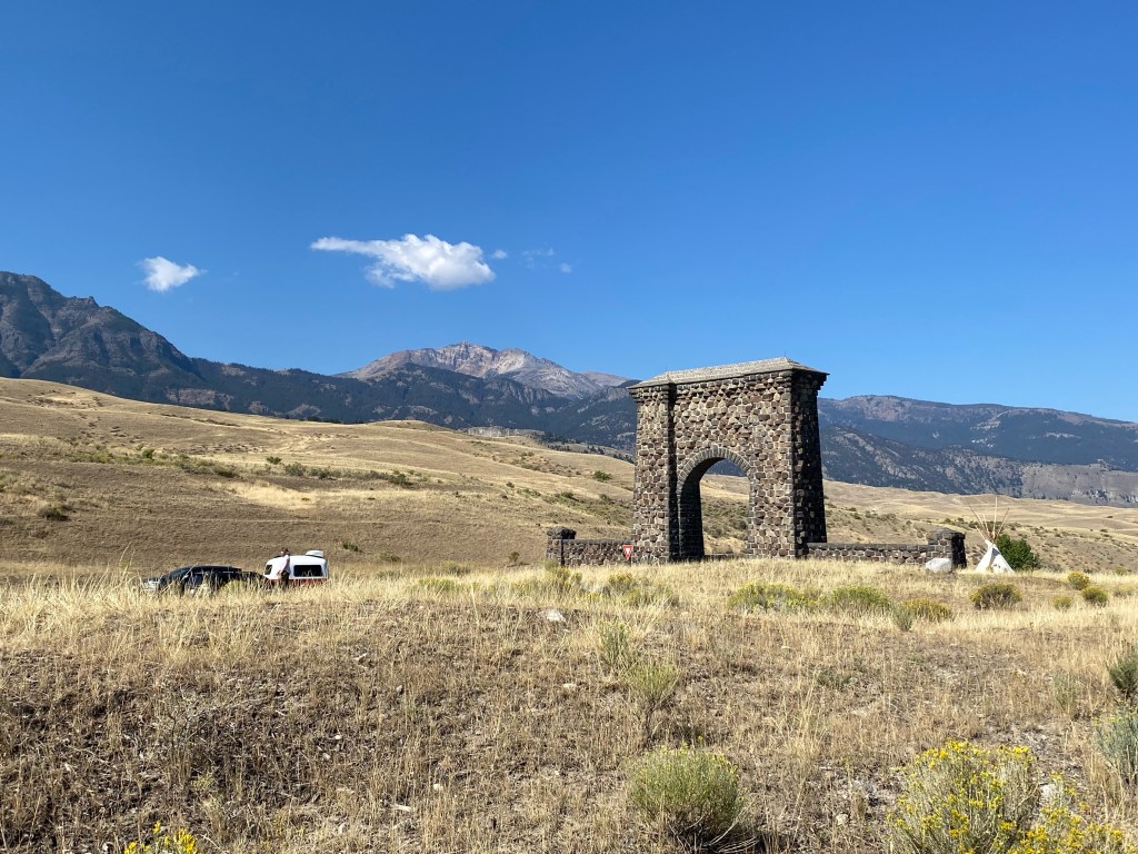 Old Faithful and its surrounding geyser basins sit along the southwestern curve of Yellowstone’s figure-eight Grand Loop Road. I followed the northwestern section of the road to reach the town of Gardiner, the historic 19th-century entrance to Yellowstone National Park. Here, a stone arch rises out of the landscape, unconnected to anything around it—the Roosevelt Arch, dedicated by Theodore and engraved with his vision for America’s National Parks: “For the benefit and enjoyment of the people.”