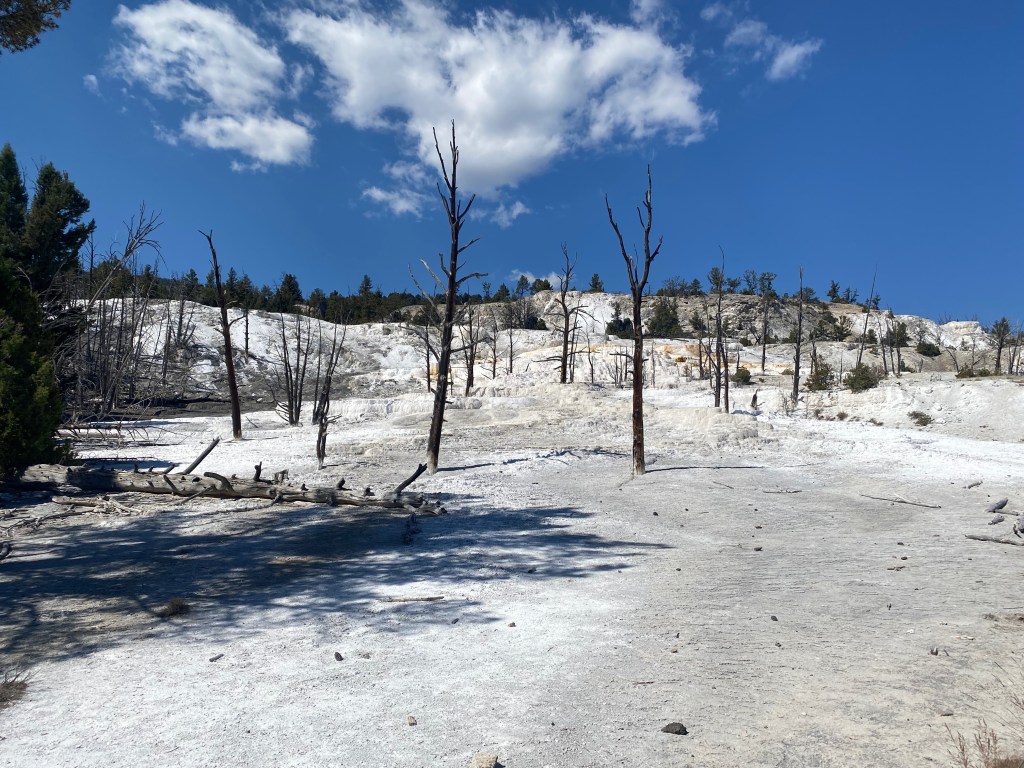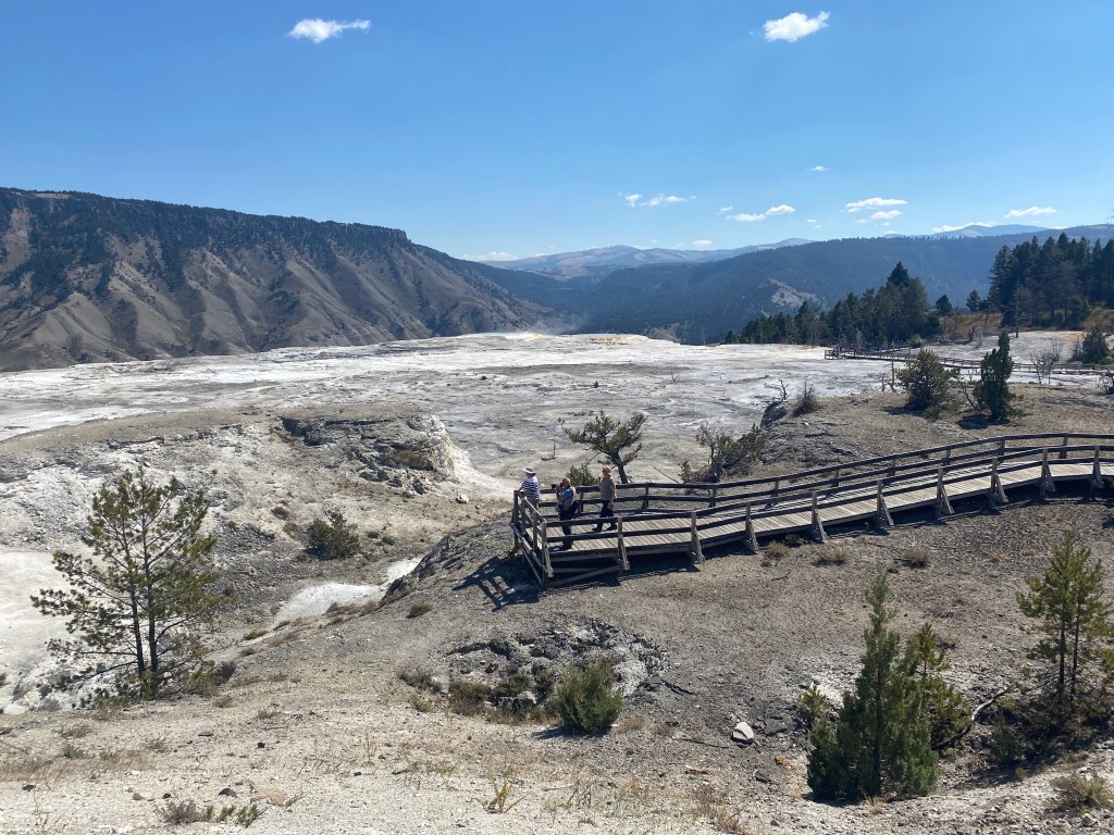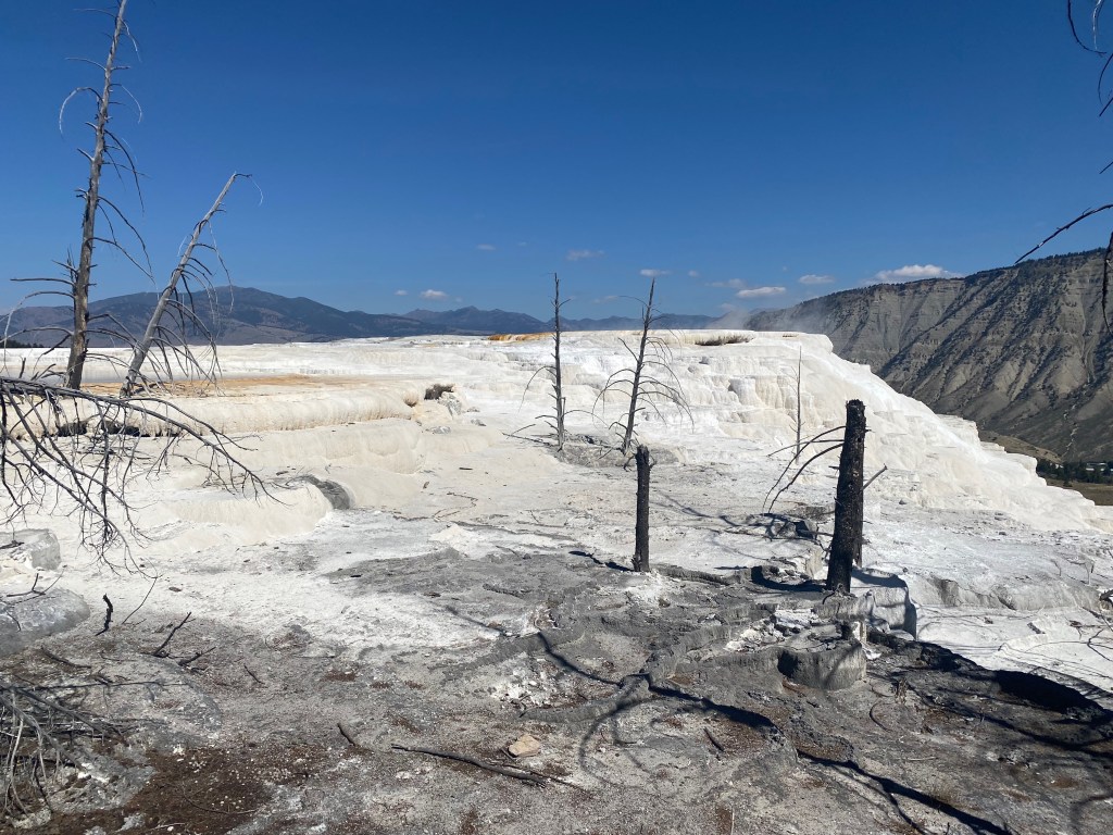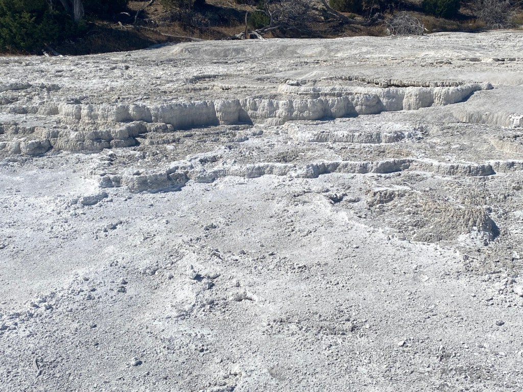 Chalky white, with occasional rust-colored streaks, the terraces seem like they’ve been transplanted from the surface of the moon. While there’s still some hydrothermal activity on the surface in the Mammoth area, on the whole it’s much drier than geyser basins to the south. It’s equally spectacular, albeit in a whole different way, reinforcing the good fortune that Yellowstone visitors have to see so many varied examples of geothermal activity clustered in one place. Benefit and enjoyment, indeed.