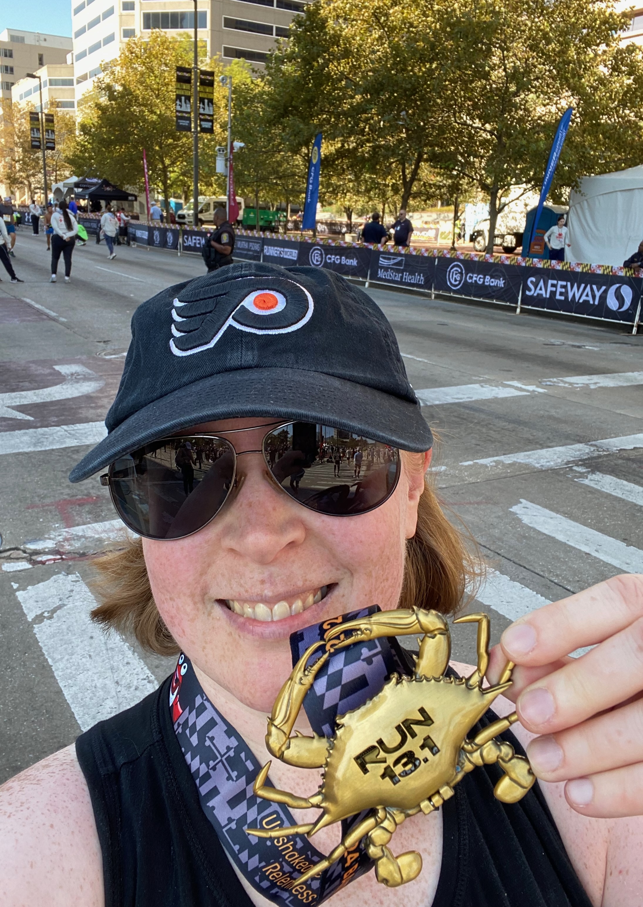 I did that half-marathon, and have finished four more since—including yesterday’s Baltimore Half-Marathon to celebrate my 42nd birthday. I’ve learned that 13.1 miles is my favorite race distance, because it’s a challenge and a commitment but also invigorating, an opportunity to get out and move in a big, sustained way. The yoga classes and weight lifting and walking (I walk all these races; as much joy as I’ve found in movement, I hate the plodding jolt of running even more as I get older) have shown me that I don’t dislike exercise, I dislike gym classes and vicious field hockey games and having a softball come at me while everyone else on the field is watching to see if I’ll catch it or drop it (again).
