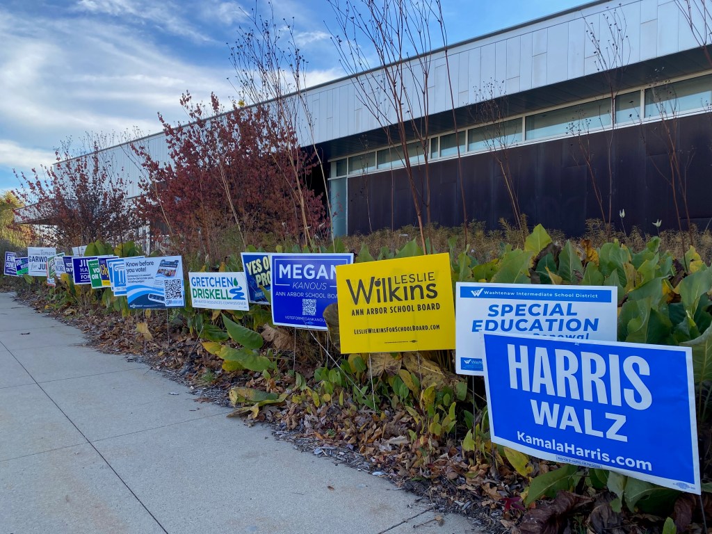 Featured image: Election signs outside the Traverwood Branch of the Ann Arbor District Library, November 2, 2024.