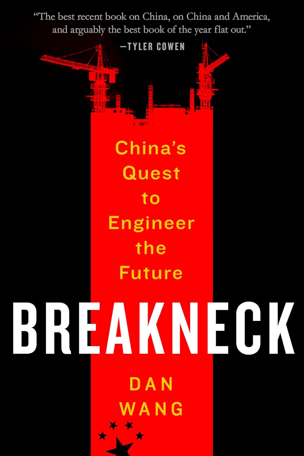 The first copy of Breakneck I received looked like the quintessential fear-mongering China book. Against an inky black background a red graphic appeared—somewhat difficult to identify, but it seemed to be a towering building with cranes or construction equipment extending from its top. BREAKNECK, in white, stretched across the lower third of the space, and the five stars that appear on the flag of the People’s Republic of China showed up near the tower’s base. In its body, written in a shade of yellow also taken from the PRC flag, was the book’s subtitle: “China’s Quest to Engineer the Future,” with the name of author Dan Wang below. In its colors and imagery, this was practically the cover that generative AI would compose for a book about how China was going to rule the world.